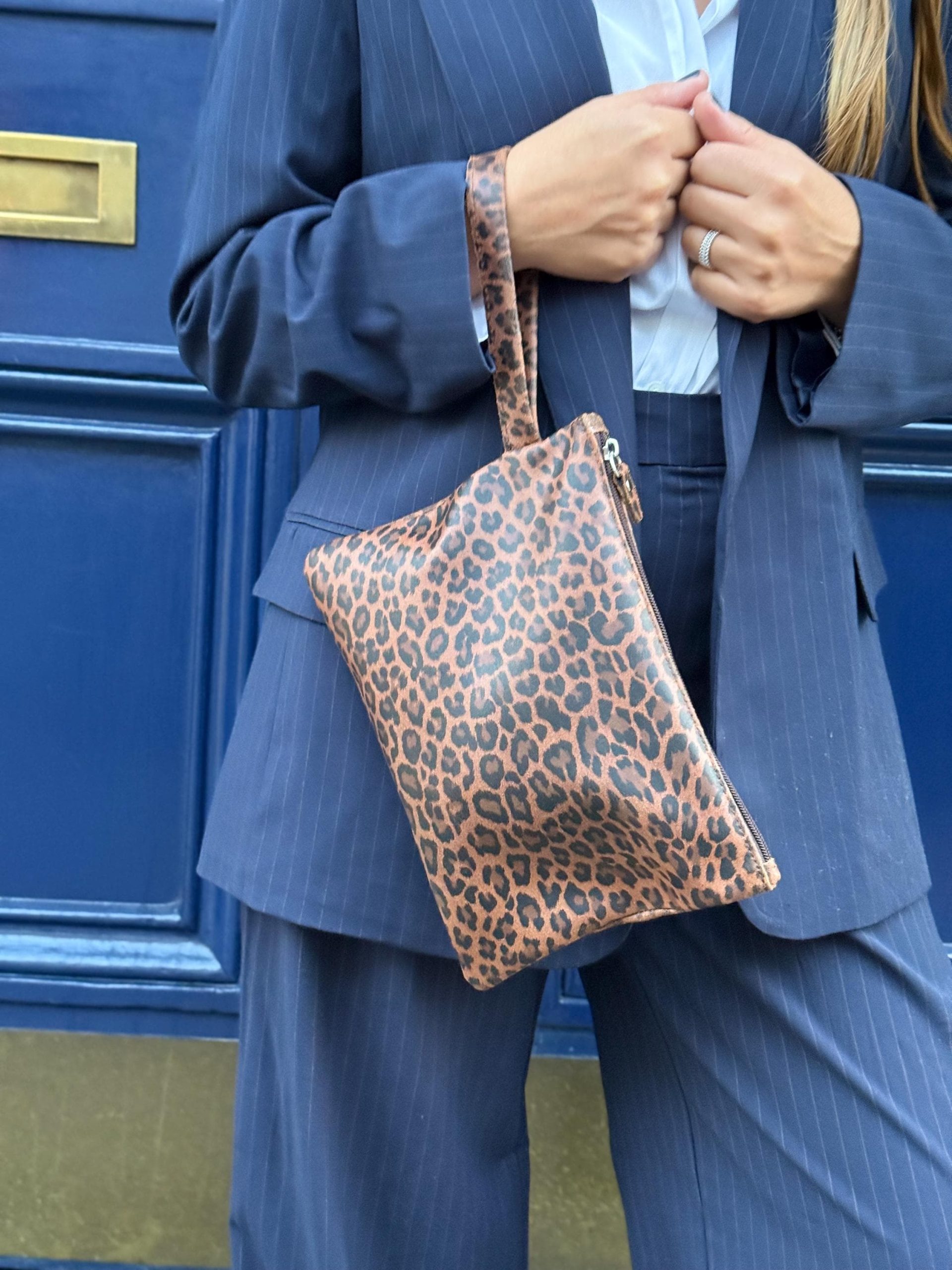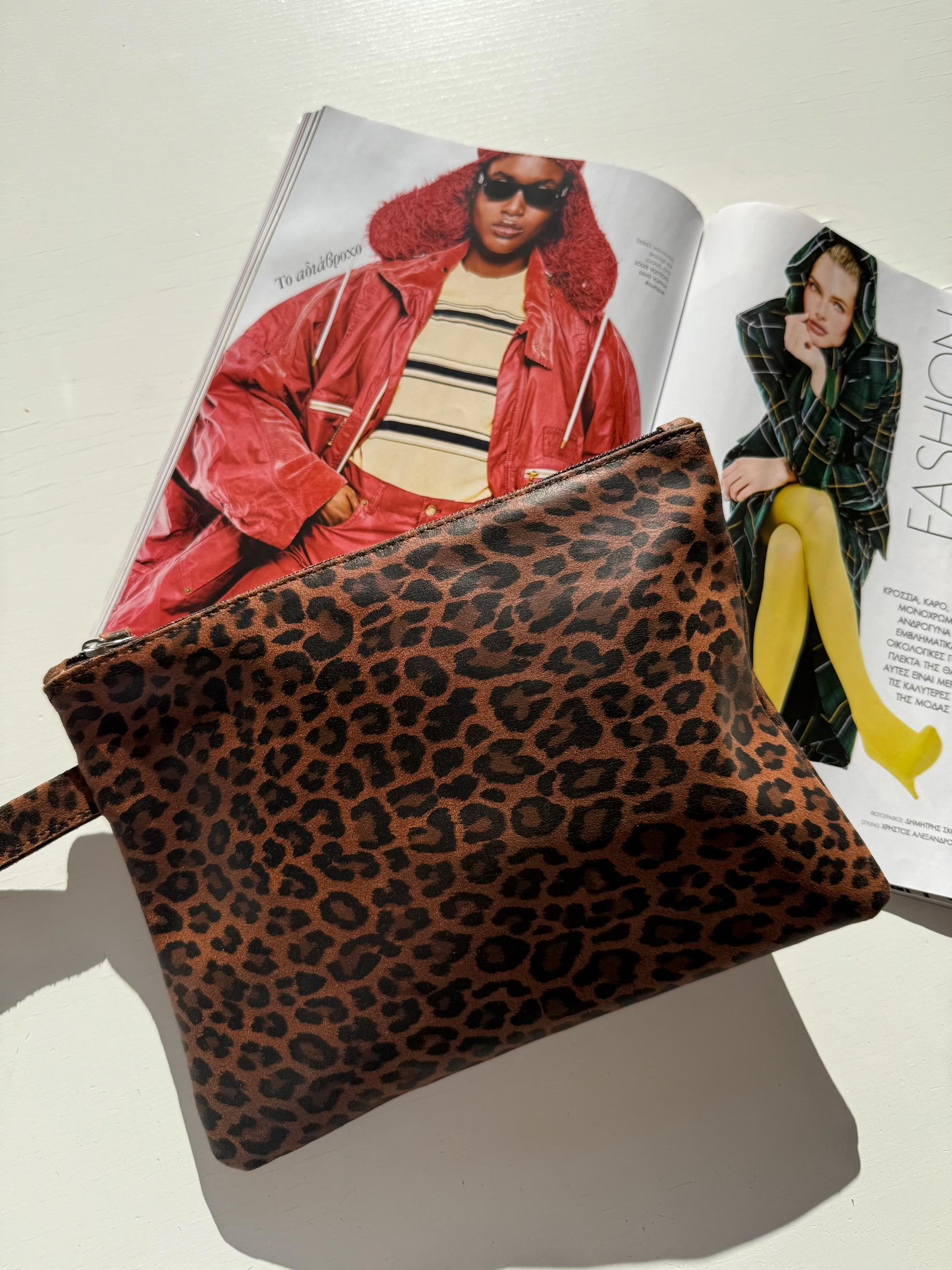 This handmade clutch bag is crafted from full grain leather in a stunning leopard print. It features a side leather strap, zipper closure, and metal details. A statement piece that adds bold sophistication to every outfit from everyday wear to night-out looks.
